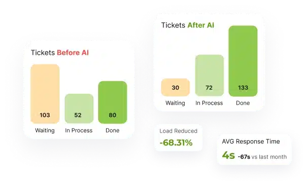 Support tickets pile up with 70% being repetitive questions, killing response times and satisfaction.